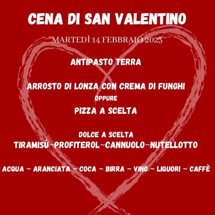 martedì 14 febbraio 2023, prenota la tua cena con la tua dolce metà. Antipasto terra, a scelta arrosto o pizza, dolce e bevanda.