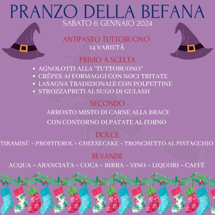 06 gennaio 2023, pranzo della Befana. Il menù prevede antipasti terra e mare, primo a scelta, secondo, dolce e bevante.